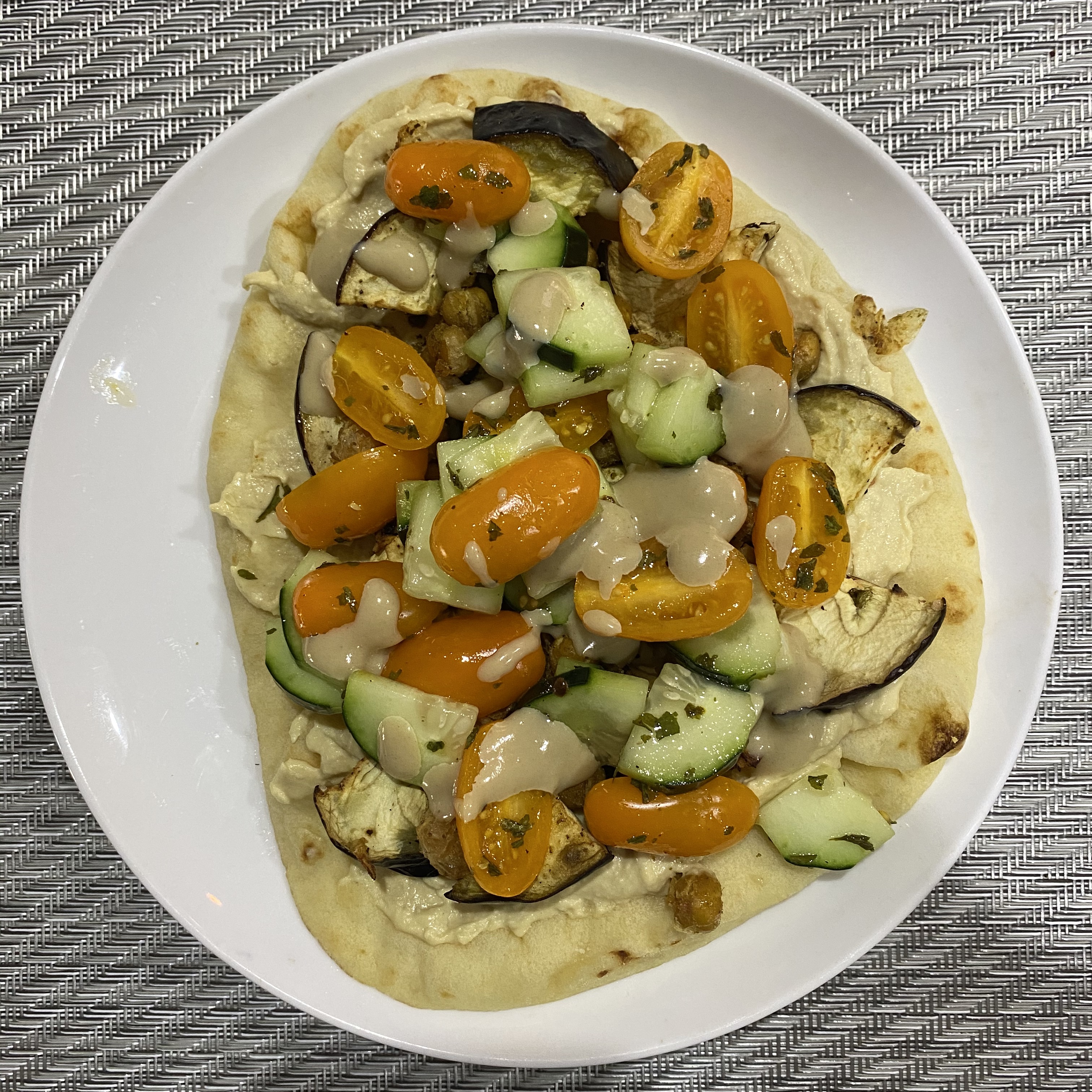 Naan topped with all kinds of stuff - eggplant, cucumber, tomatoes, chickpeas